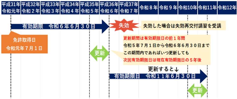 画像のように有効期限が 令和6年6月30日 の場合、更新手続きは 令和5年7月1日から行えます。